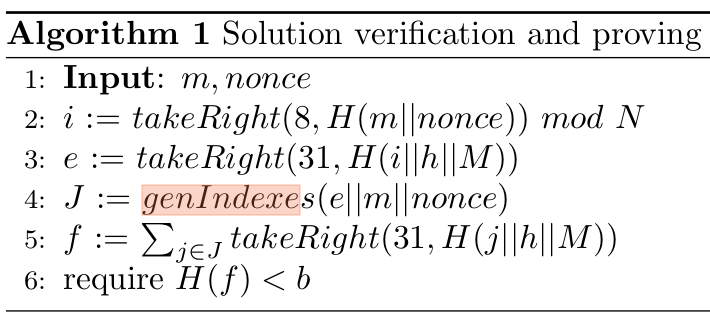 - Indexes calculation also involving the same table (which elements are last 31 bytes of H(i | | h | | M ), where i is in [0, N), h is block height, M is padding to slow down hash calculation (8kb of constant data).