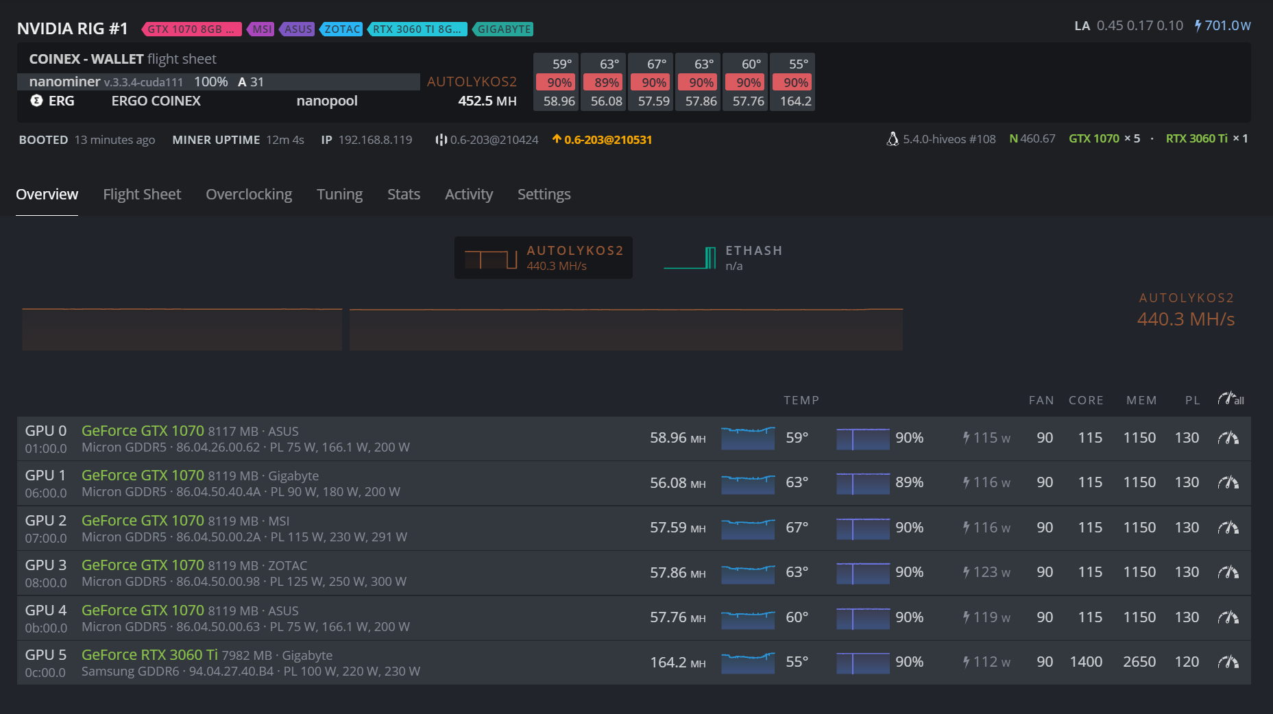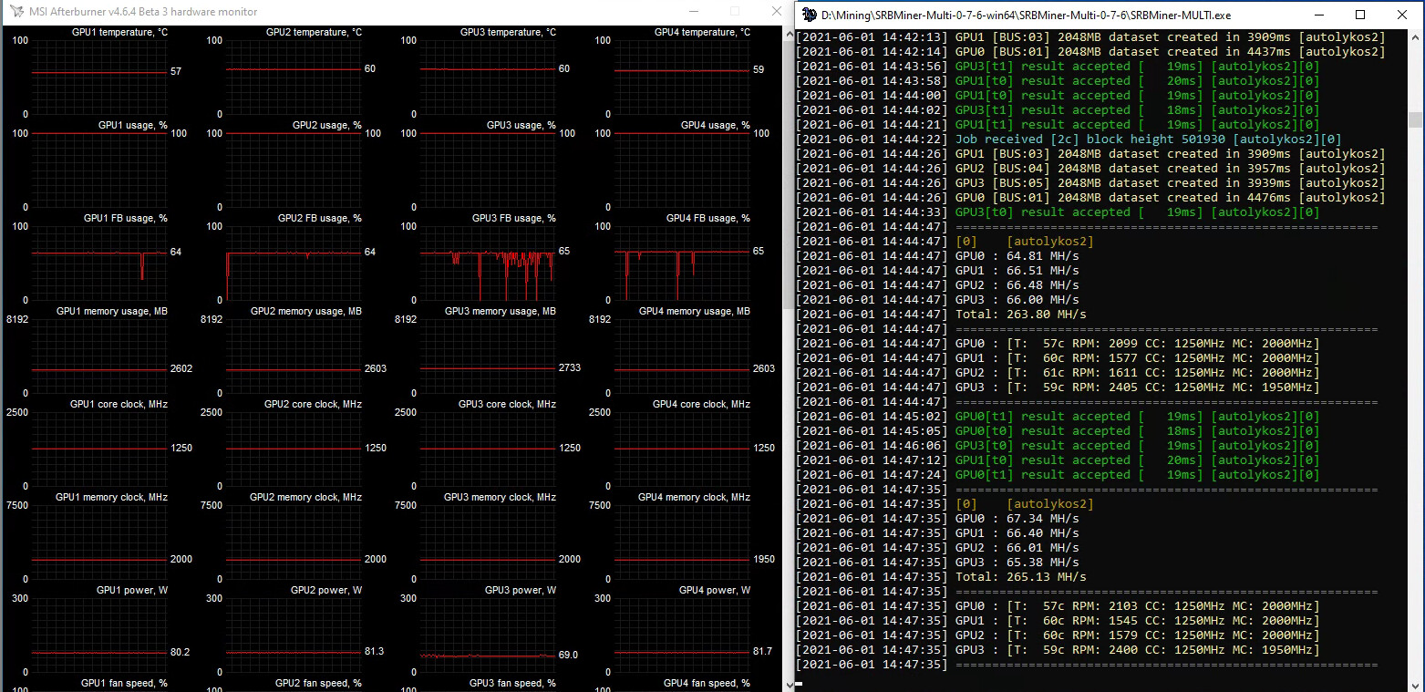Nanominer, RTX 3060 ti, PL60%, Mem +1200, Core-300 = 165mh/s