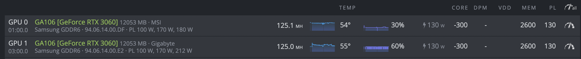Edit: 115Mhs, 122w, +1000 mem -500 gpu clk, 67% power limit (seem to be the point of diminishing returns).