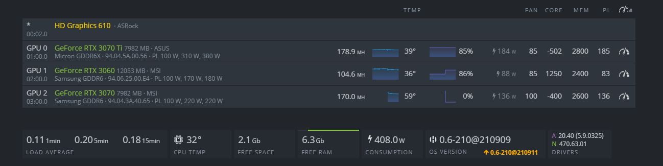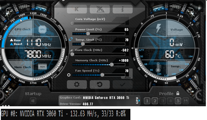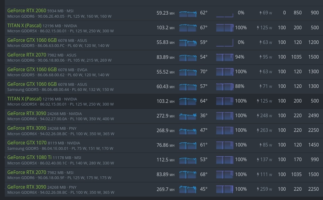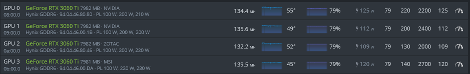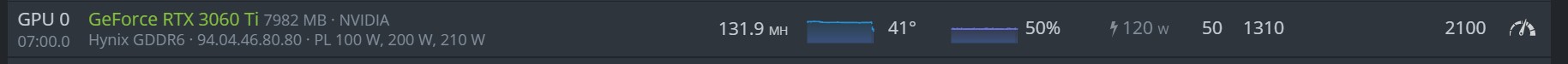 Palit 3060Ti LHR 129.5/130 MH/s - 117W Settings 59PL - -220 Core - Mem +850 - Fan 70% - Temp 57 Celcius