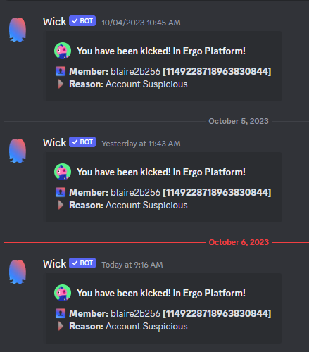 Every time I try to join the Ergo Platform Discord server (Link: Ergo Platform) I get an automated message from “Wick” calling my account suspicious.