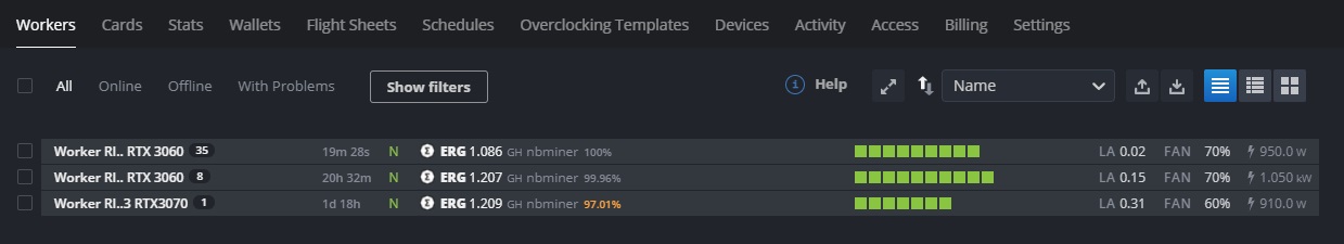 (7) RTX 3070, Core -400 Memory 2800 PL 130 W, 173 MH/s per GPU