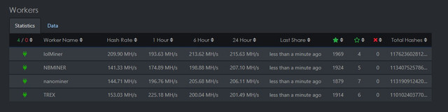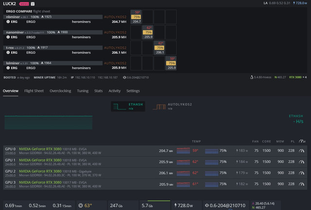 With HiveOS results: we have all of them around 205-206Mhs. Only we found that lolMiner goes down Mhs during the ERGO Data Set, all other miners doesn’t do it. During that ERGO Data Set is impossible to mine, so why they continue showing the same Mhs? We explain that at the end