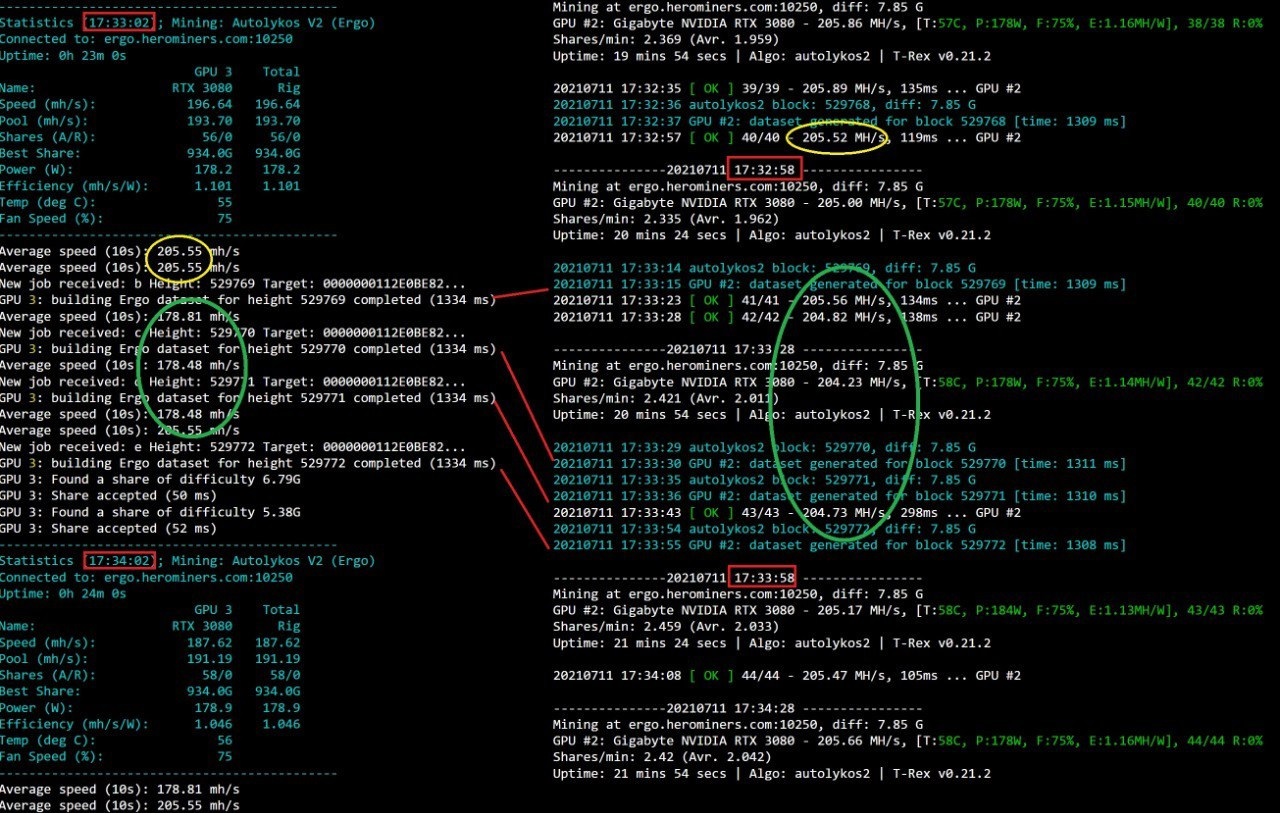 About drop hashrate we comment before. During the ERGO Data Set, that could happen 4 times in a Minute for example, the time creating the Ergo Data Set the GPUs cannot mine. In the photo you can easy see that the calculation of the Mhs in lolMiner is correctly. During last 10s, 1.3s where for the data Ergo Set and the other 8.7S for mining so that makes the Mhs to be reduced. In the other miner the T-Rex that doesn’t happen it also increase the Mhs and it is impossible to mine during that Ergo Data Set. That said the Mhs in T-Rex are not real, the Mhs have to go down during the not mining time for the Data Ergo Set, because is not possible to mine during that time. Always a picture helps to see that.