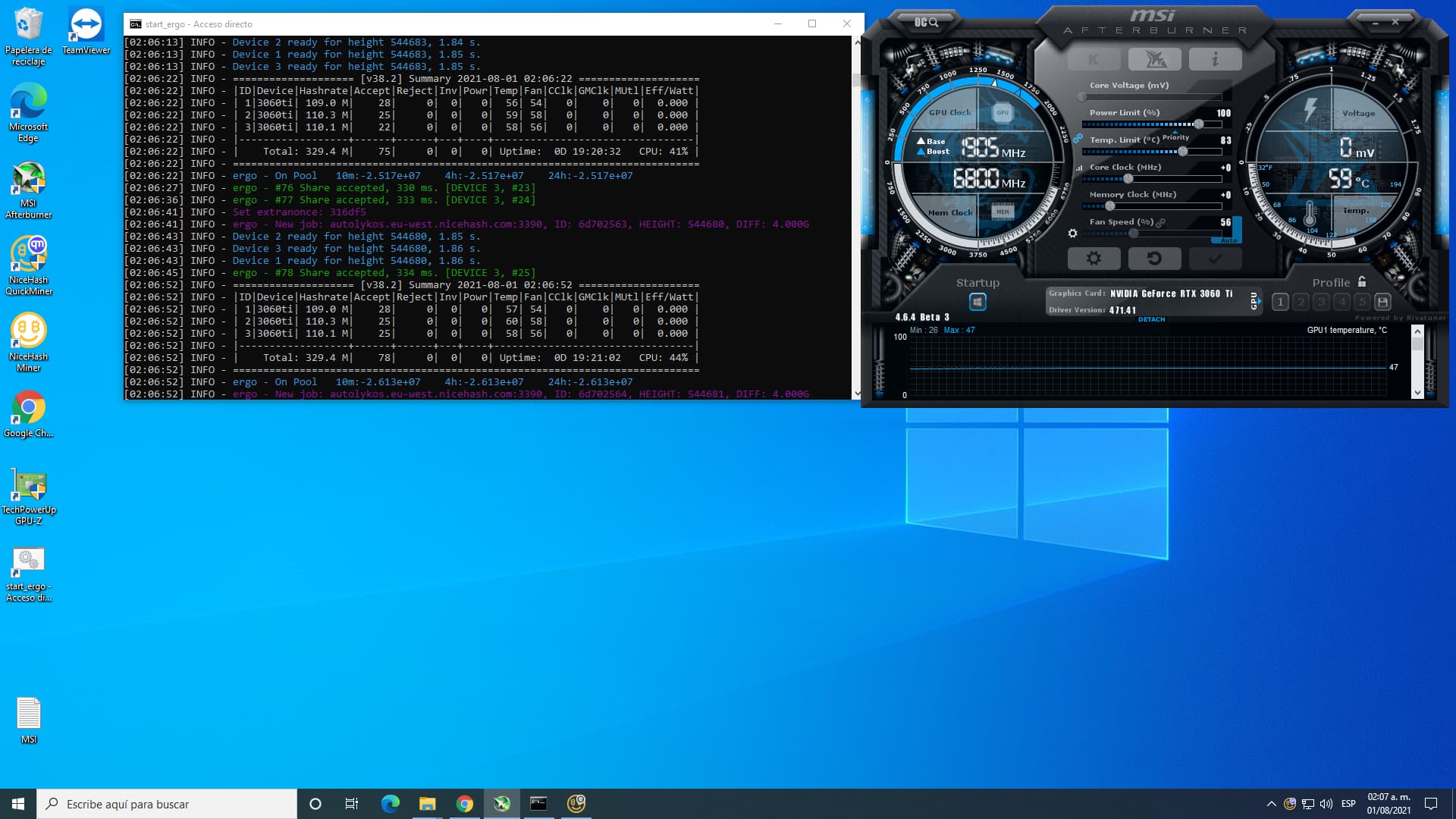 Hi to all, i have 3 3060ti LHR, zotac twin edge to be exactly. Everytime I do some set up at the msi after burner it’s ok, but if I run the Nb miner, it give me error and automatically set the cards to default.