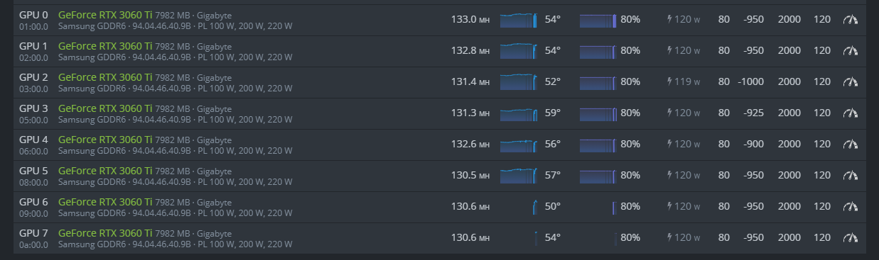 Hola chicos, tengo un problema con RTX 3060TI LHR GYGABYTHE VISION V2 8 GB, esta grafica no pasa de los 81 mhs stock, cuando de aplico overclocking llega a 100 mhs pero cae rapidamente, la memoria es samsung, alguien tiene esta grafica que me pueda ayudar? y el aftherburner el memory clock no pasa de 1900 y limite de poder 104 alguna solucion?